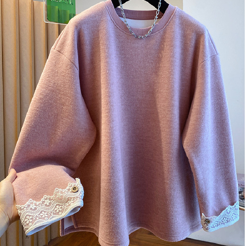 胖妹妹200斤大码超好看蕾丝边加绒卫衣女秋冬软糯磨毛加厚打底衫