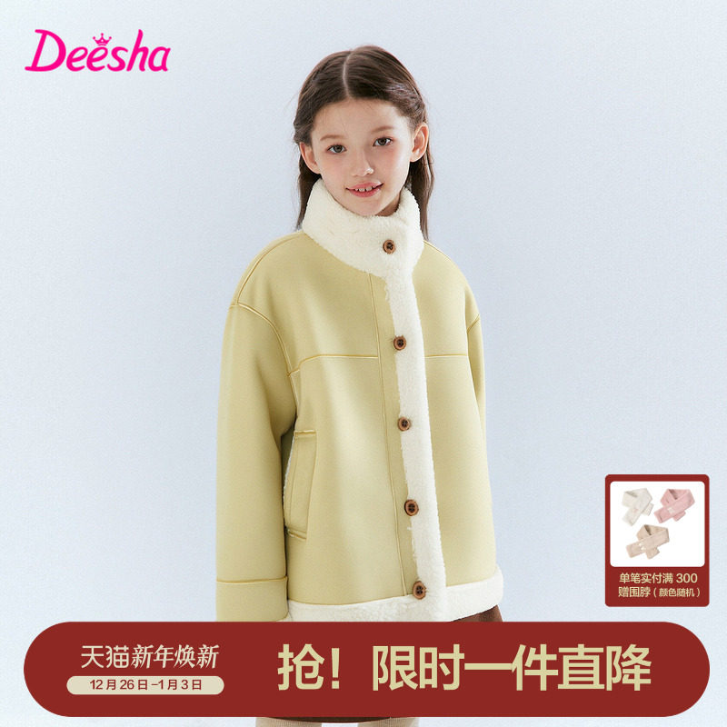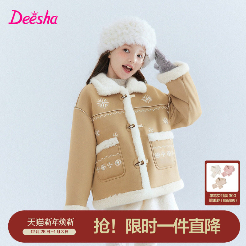 笛莎官方旗舰童装女童外套加绒秋冬季新款女孩儿童麂皮保暖羊羔绒