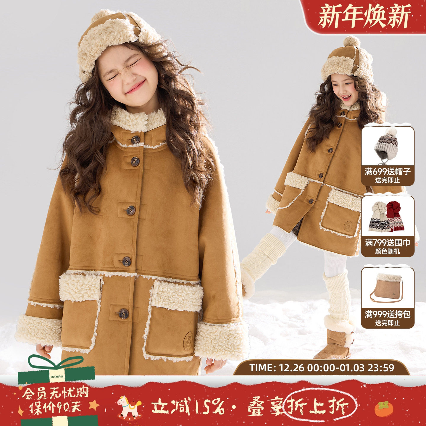 MUCMUKN【暖冬小熊】拼接麂皮羊羔绒大衣保暖外套女童25冬新款