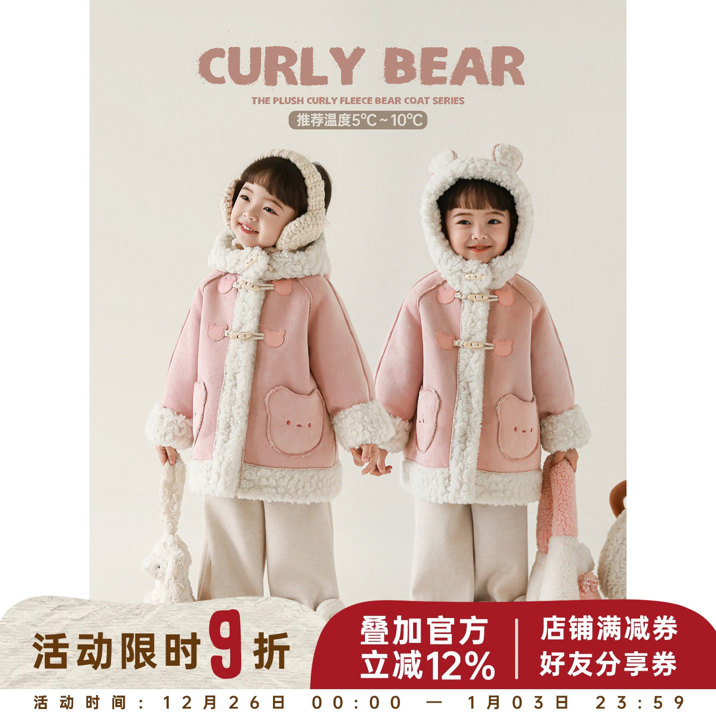 幼悠女童2025冬季新款小粉熊麂皮绒连帽外套厚实保暖儿童可爱冬装
