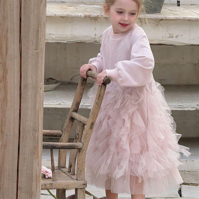女童春季卫衣裙2025洋气粉色显白甜美拼接长袖卫衣连衣裙拼接纱裙