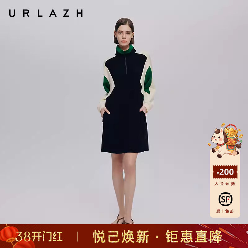 URLAZH有兰秋季新款学院风复古小立领撞色宽松长袖卫衣连衣裙女