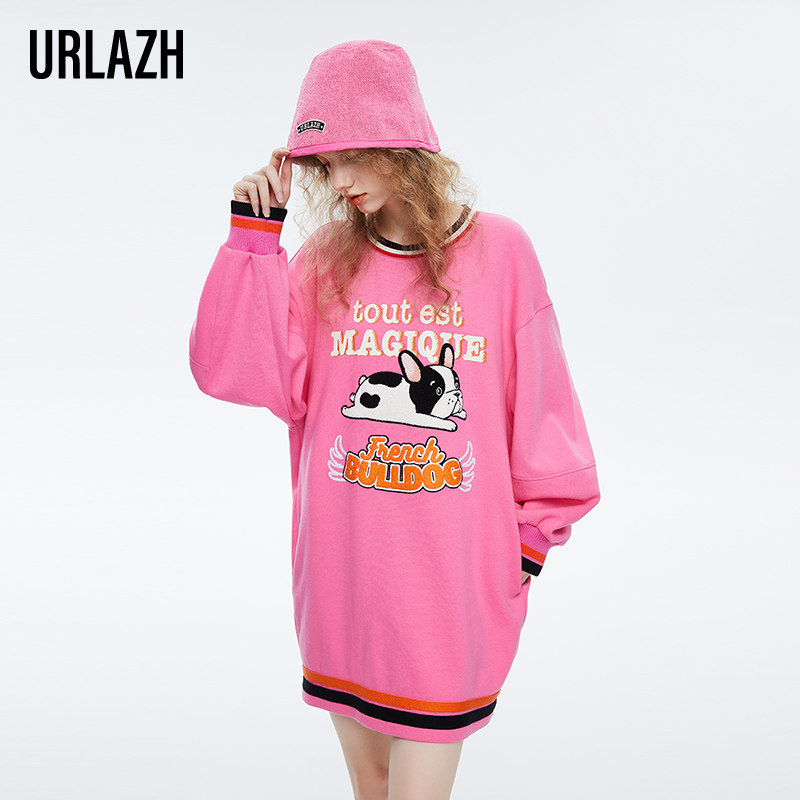 URLAZH有兰春秋新款宽松减龄温柔粉色休闲圆领长袖卫衣连衣裙