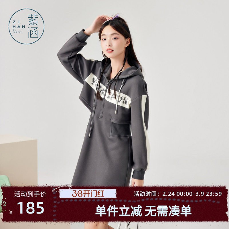 紫涵拉链门襟连帽卫衣裙子女春秋季新款休闲运动风收腰长袖连衣裙