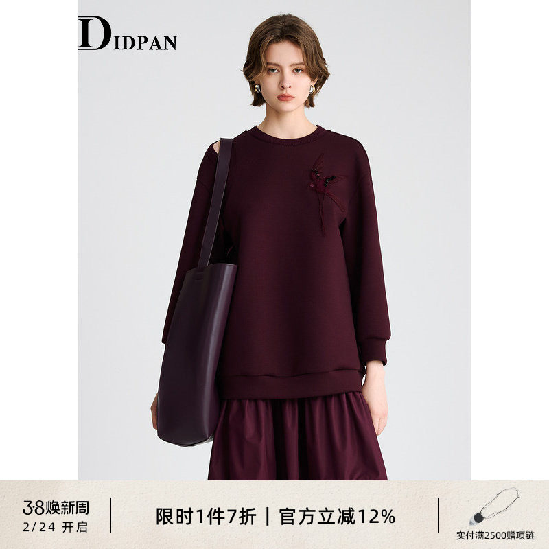 IDPAN卫衣式连衣裙冬季新款圆领长袖精致露肩喜鹊刺绣裙子女