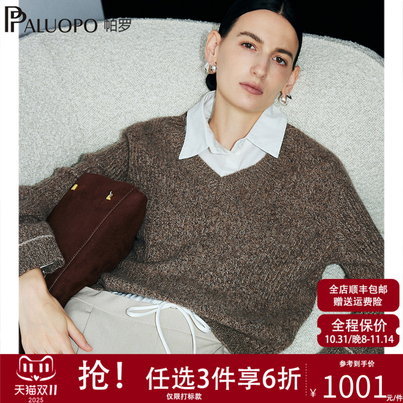 雪中飞2025秋新款拉毛羊毛衫含山羊绒女士长袖毛衣纯色V领羊毛衫