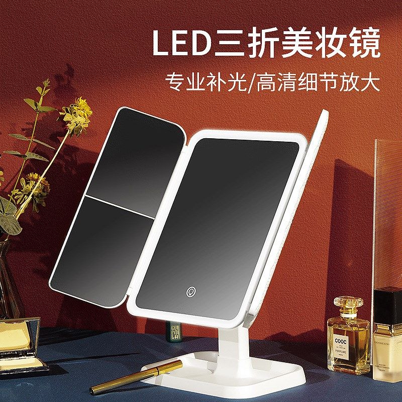 LED化妆镜带灯大号三折台式台灯镜子折叠梳妆镜方形放大镜usb插电