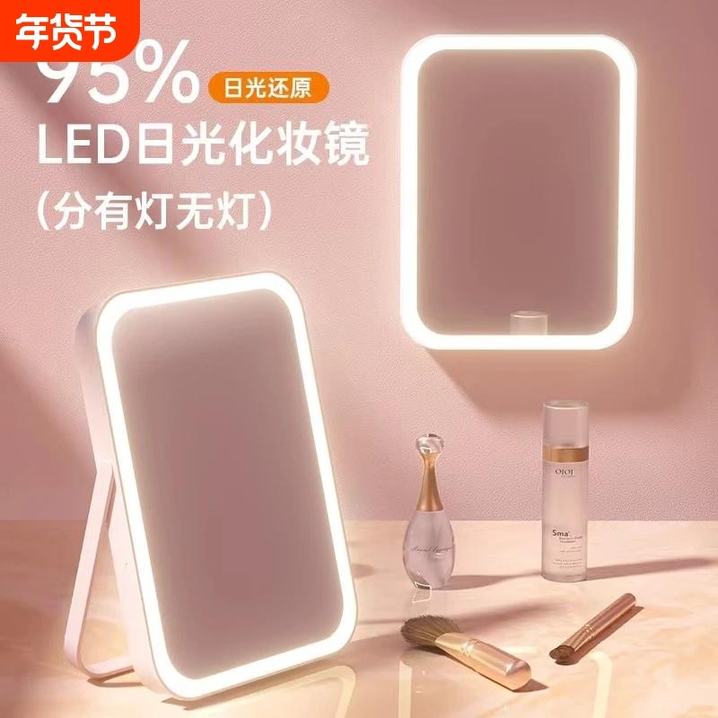 led化妆镜带灯补光女ins风小镜子桌面便携梳妆镜折叠学生太阳台灯