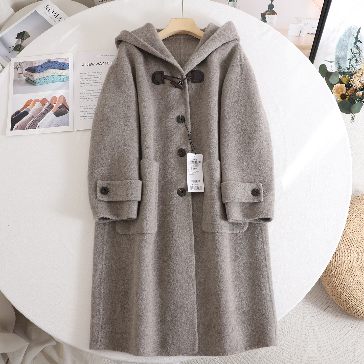 茉莉雅集30羊绒70羊毛双面呢连帽牛角扣大衣WDY07011
