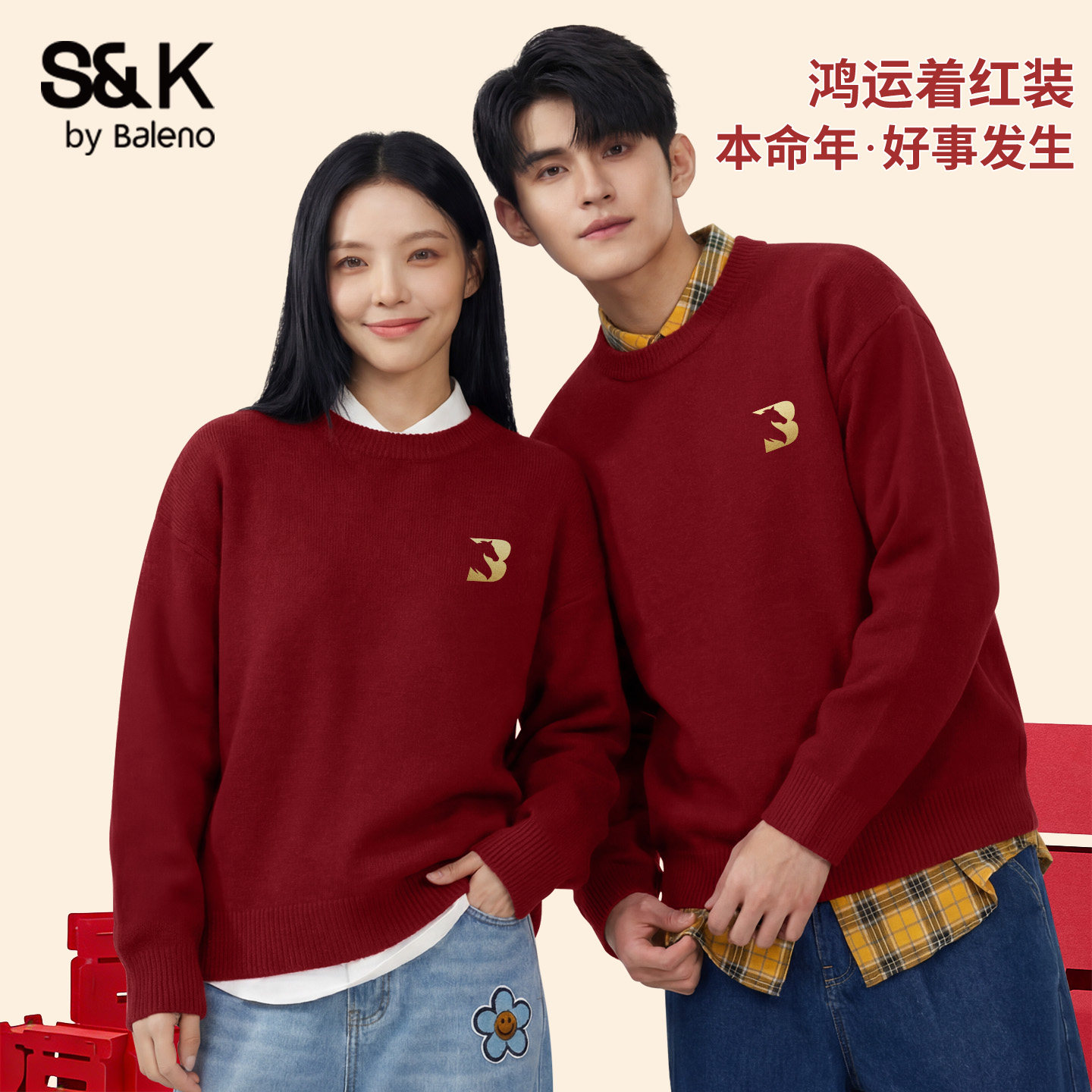 班尼路S&K红色毛衣男冬季2026马年本命年衣服新年情侣装冬装内搭Y