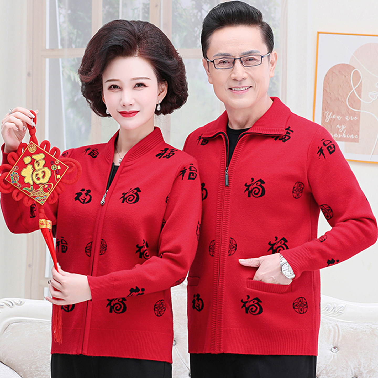 中老年人拉链开衫男秋冬装爸妈情侣针织外套本命年大红色保暖毛衣