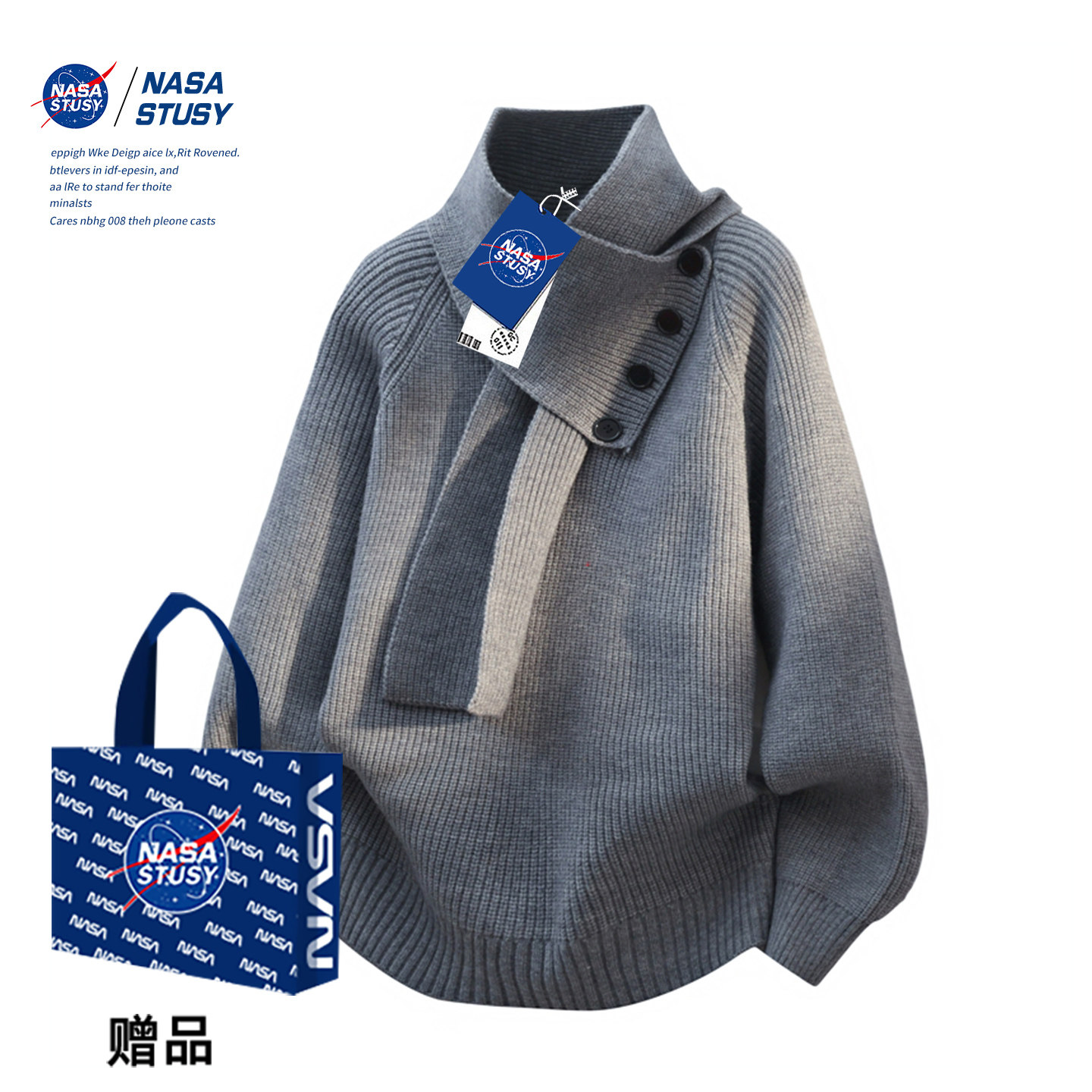 NASA STUSY美式高街2025新款秋冬装男款针织衫情侣亨利领潮牌毛衣