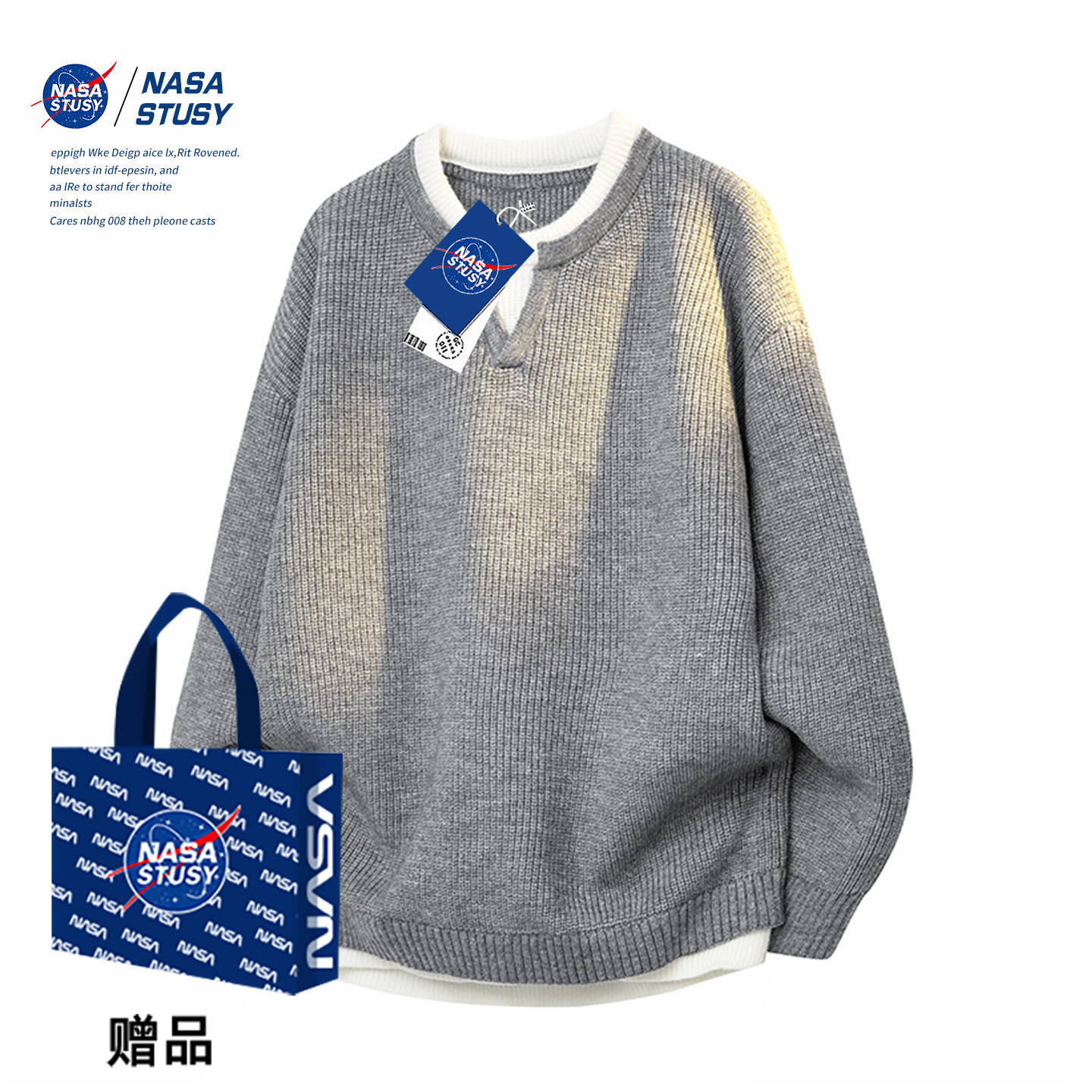 NASA STUSY美式高街2025新款秋冬装男款针织衫情侣潮牌假两件毛衣