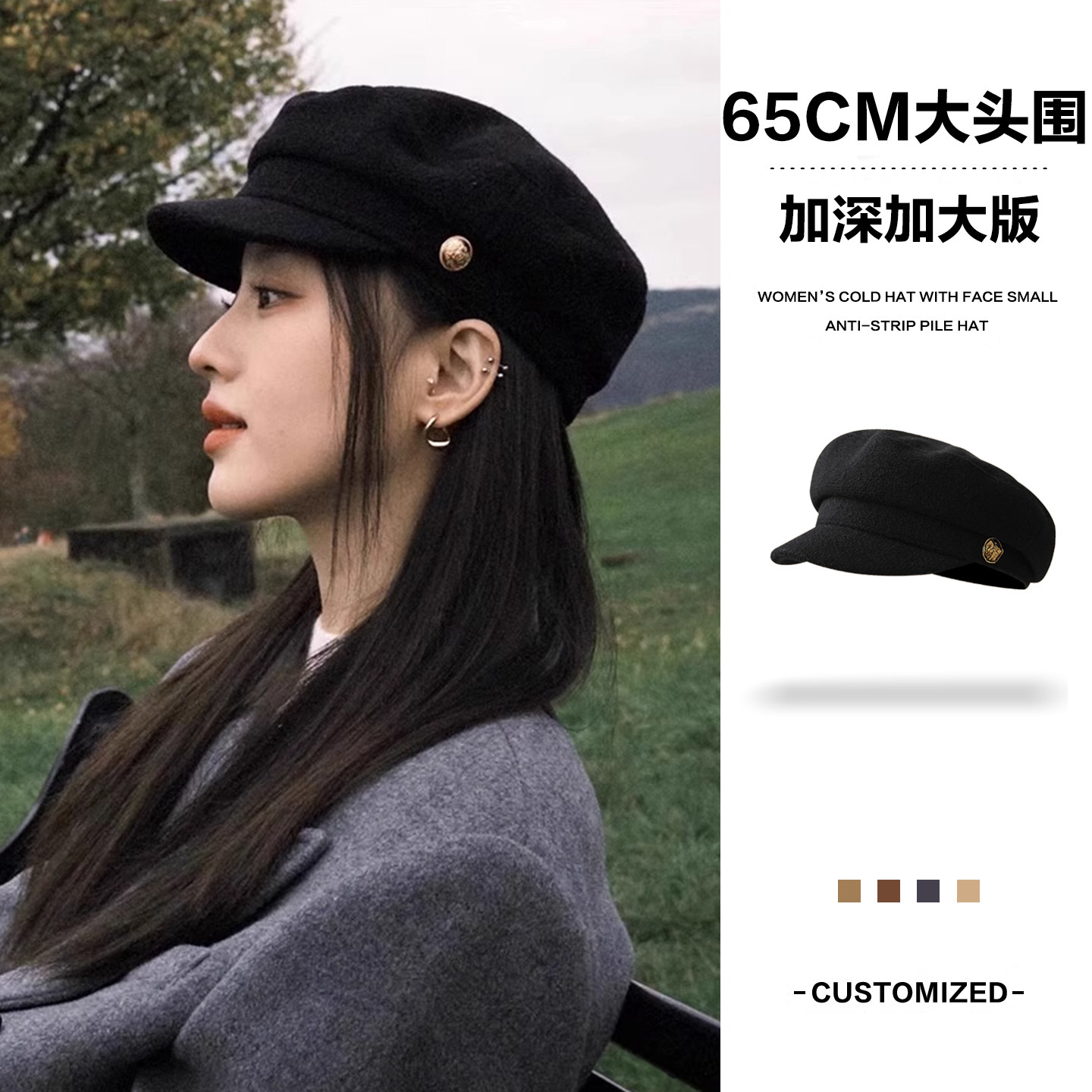 高级感复古黑色毛呢贝雷帽女秋冬大头围英伦风显脸小百搭报童帽子