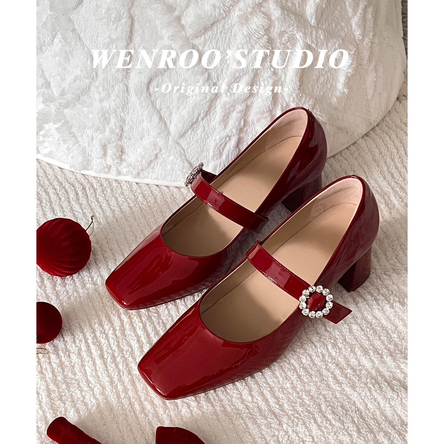 法式水钻一字带玛丽珍高跟鞋女粗跟复古红色婚鞋2026新款方头单鞋