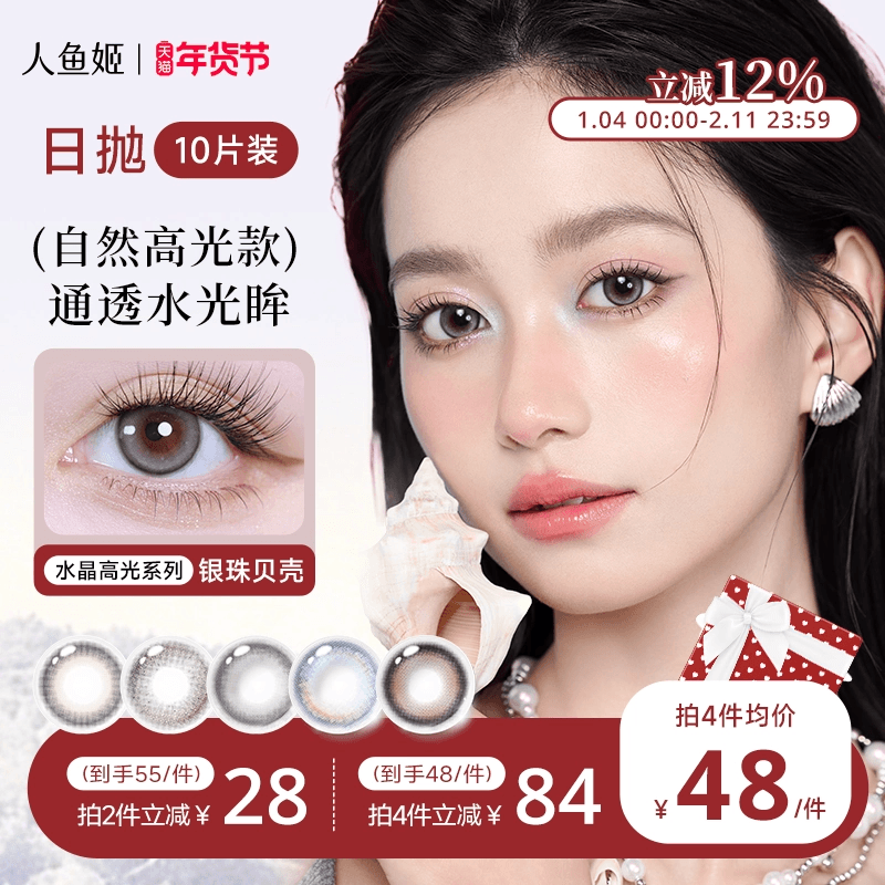 人鱼姬美瞳日抛水润自然小直径微混血早安蜜光10片银珠贝壳黑芝士