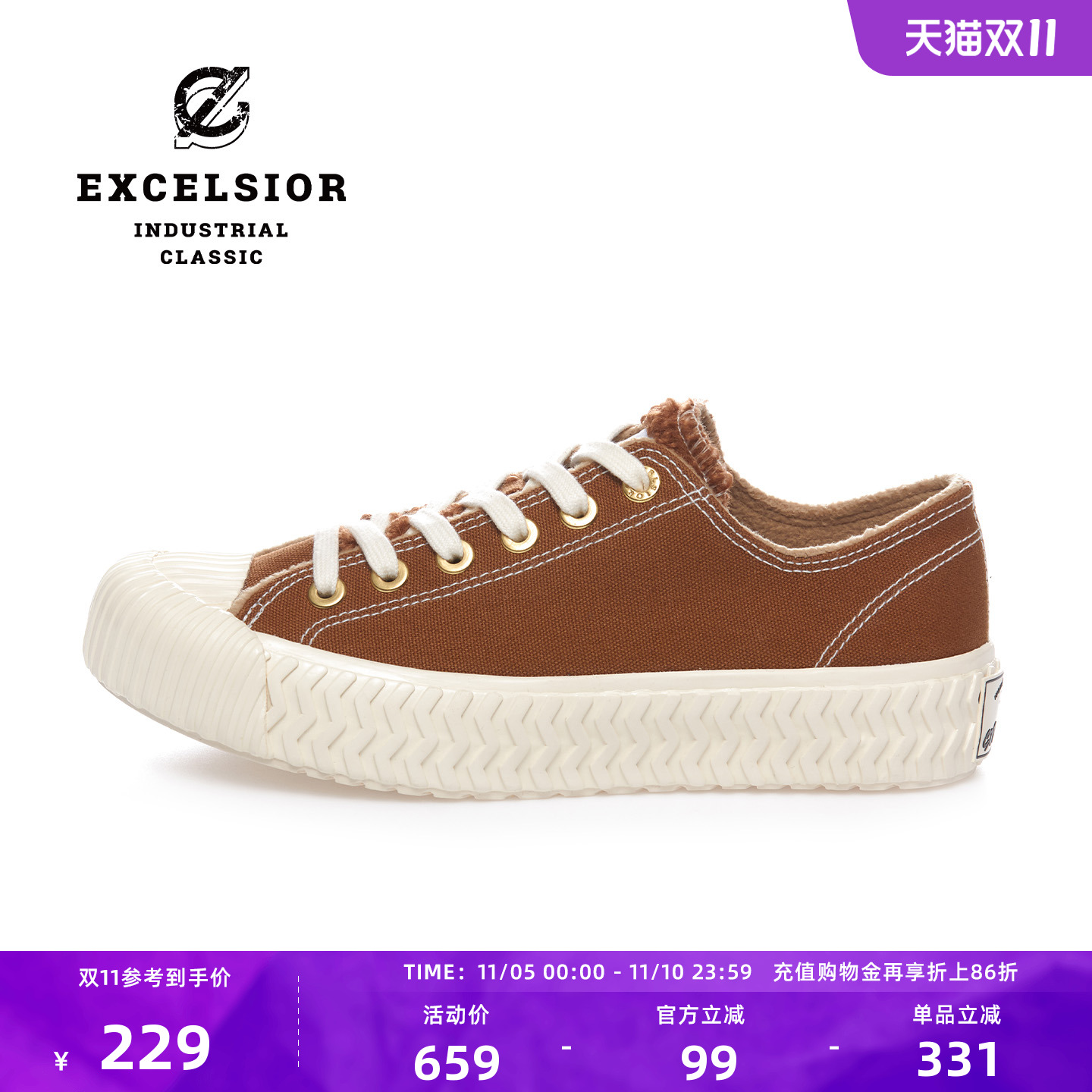 excelsior官方 秋冬棕色女鞋低帮休闲鞋增高板鞋厚底加绒帆布鞋男