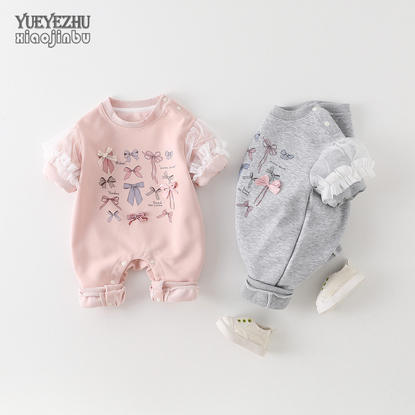婴儿秋装连体衣洋气蝴蝶结包屁衣新生女宝宝满月衣服百天公主哈衣
