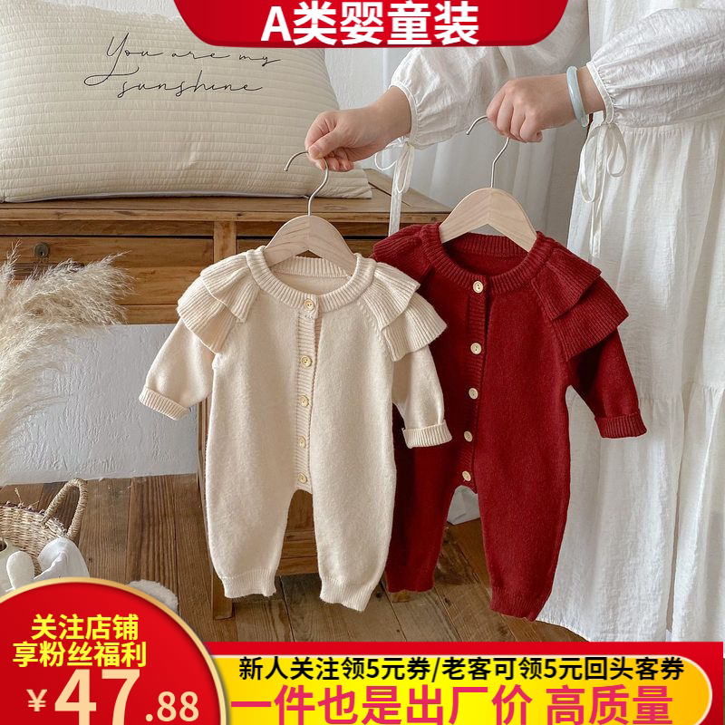 婴儿秋装连体衣女宝宝外出哈衣满月百天礼服春秋抱衣爬服超萌洋气