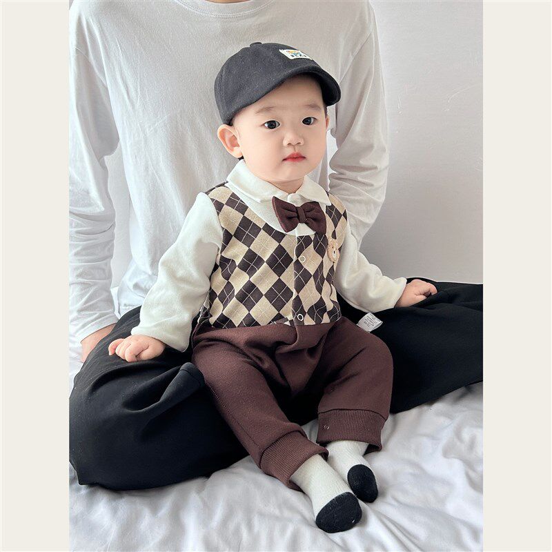 婴儿秋装连体衣七个月男宝宝超萌哈衣秋冬薄棉保暖绅士哈衣外出服