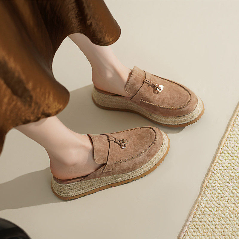 复古外穿厚底包头半拖鞋女磨砂真皮懒人凉拖草编坡跟松糕显瘦单鞋