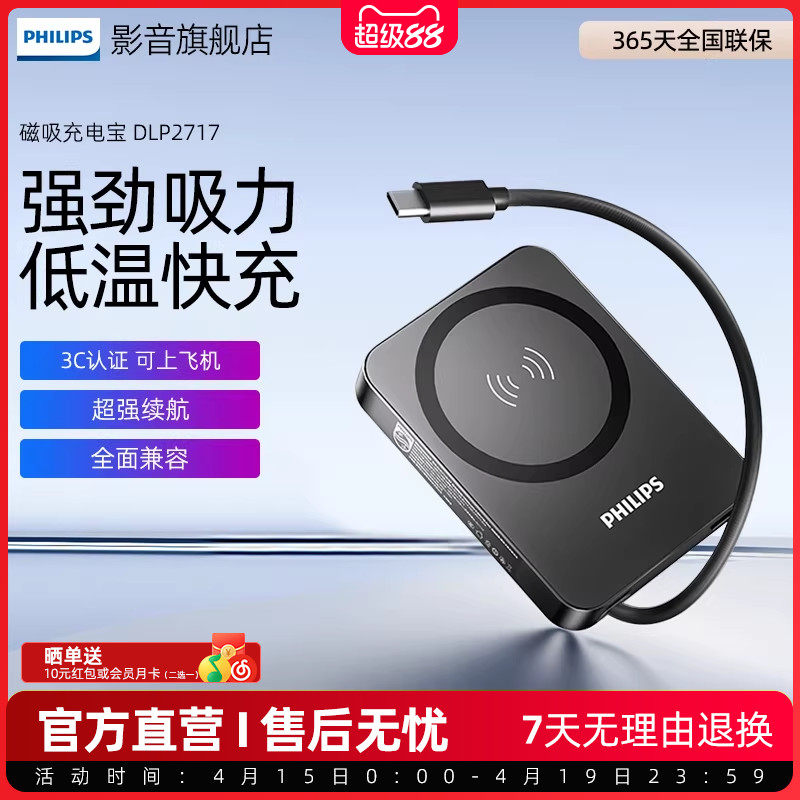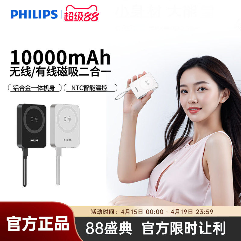 3C认证充电宝可上飞机】飞利浦磁吸无线充电宝10000毫安超薄正品