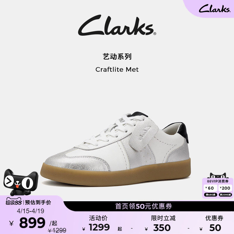 Clarks其乐Craftlite Met女鞋牛皮圆头拼接休闲运动银色德训板鞋
