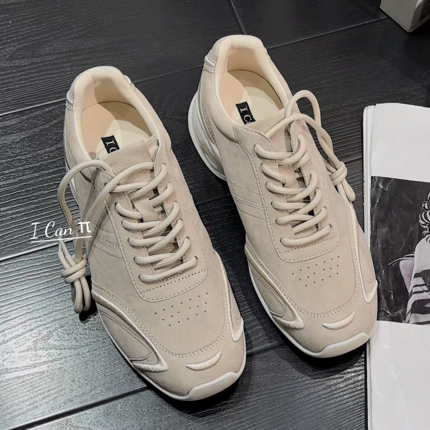 ICAN欧货女鞋2026年早春新款牛皮拼色圆头双色系带厚底运动休闲鞋