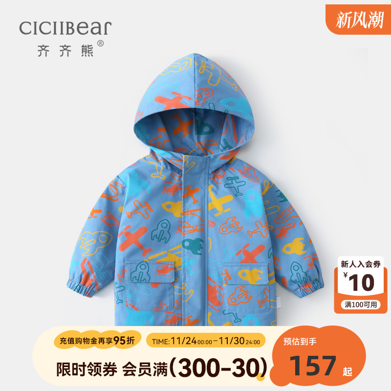 齐齐熊男童风衣外套春秋款儿童冲锋上衣小童女童连帽宝宝防水防风
