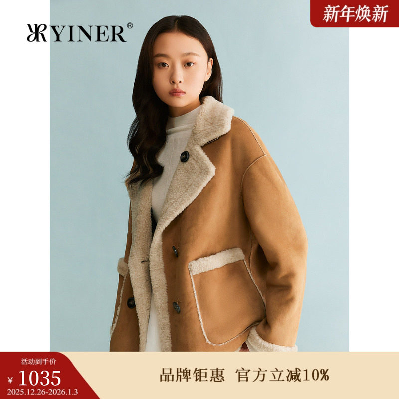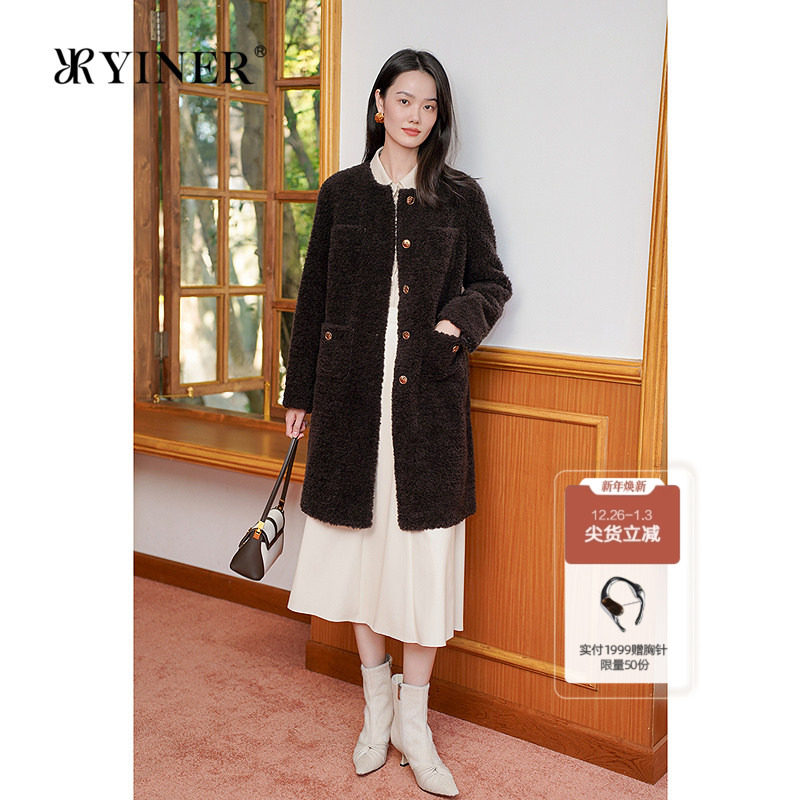 YINER音儿专选2025春季新款雅丹风中长款环保羊毛皮草大衣外套