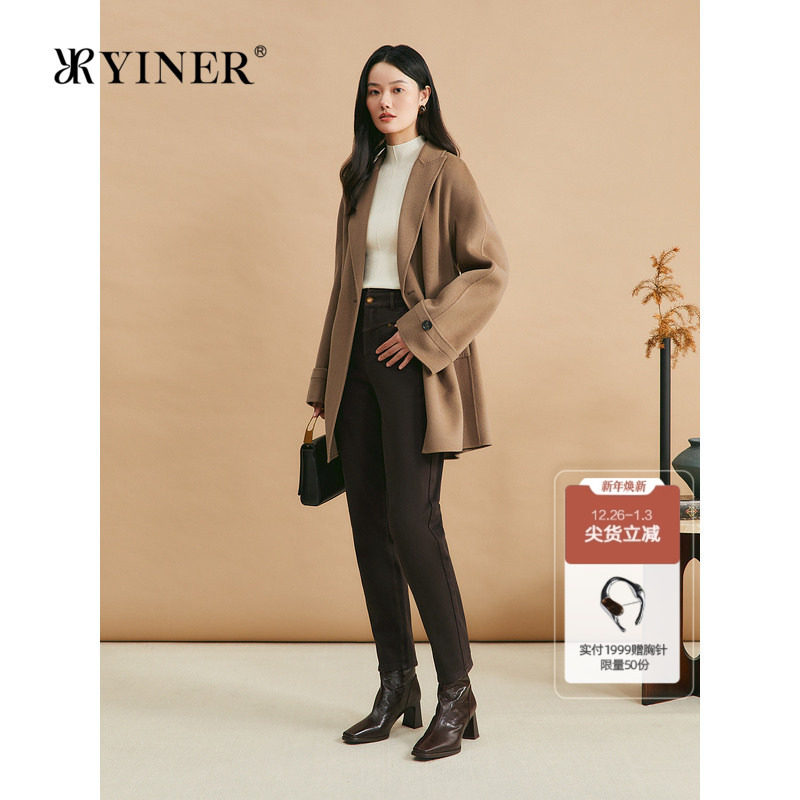 YINER音儿专选女装冬季法式气质西装领羊毛混纺双面呢大衣外套