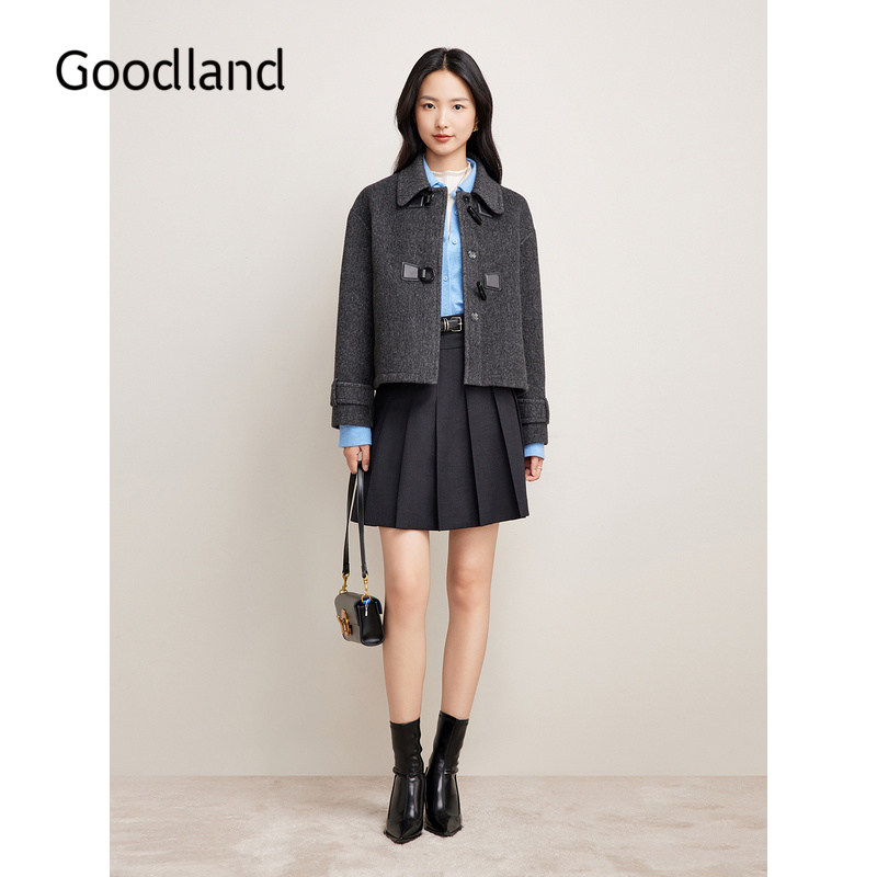 Goodland美地灰色牛角扣翻领大衣外套女短款羊毛羊驼毛LC34510210