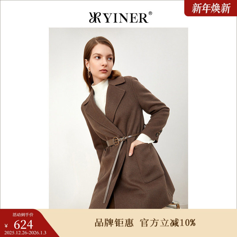 YINER音儿专选2026春季新款西装领蚕丝羊毛羊绒混纺双面呢大衣