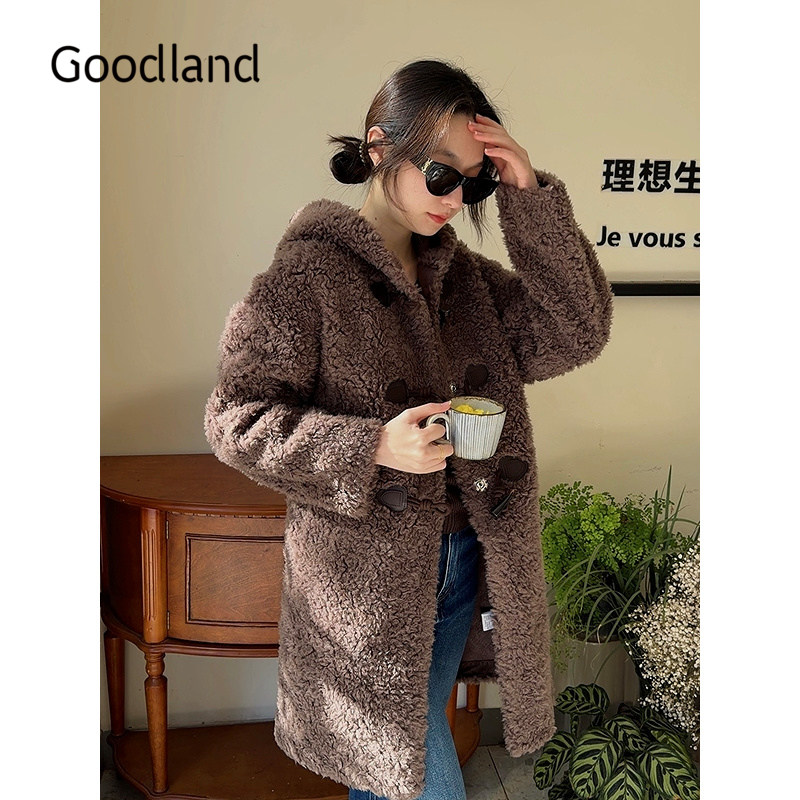 Goodland美地牛角扣羊羔毛连帽大衣外套女仿皮毛一体LC34580430