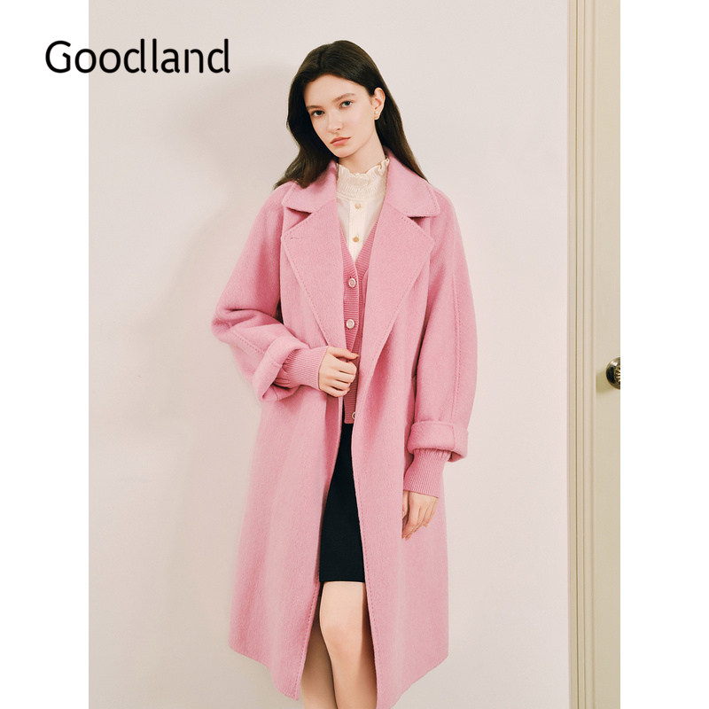 Goodland美地女装冬季粉色腰带羊毛羊驼毛大衣外套中款LC34580130