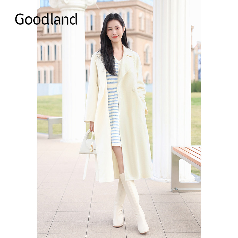 Goodland美地奶油白色翻领系带绵羊毛大衣外套女长款LC34580070