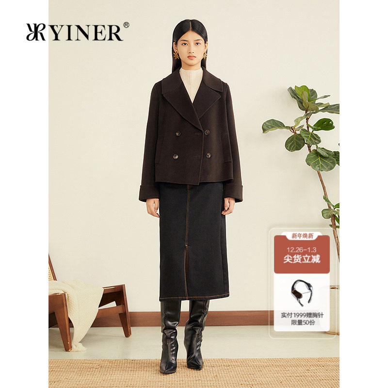 YINER音儿专选2025冬季新款短款翻领羊毛羊绒混纺双面呢大衣外套