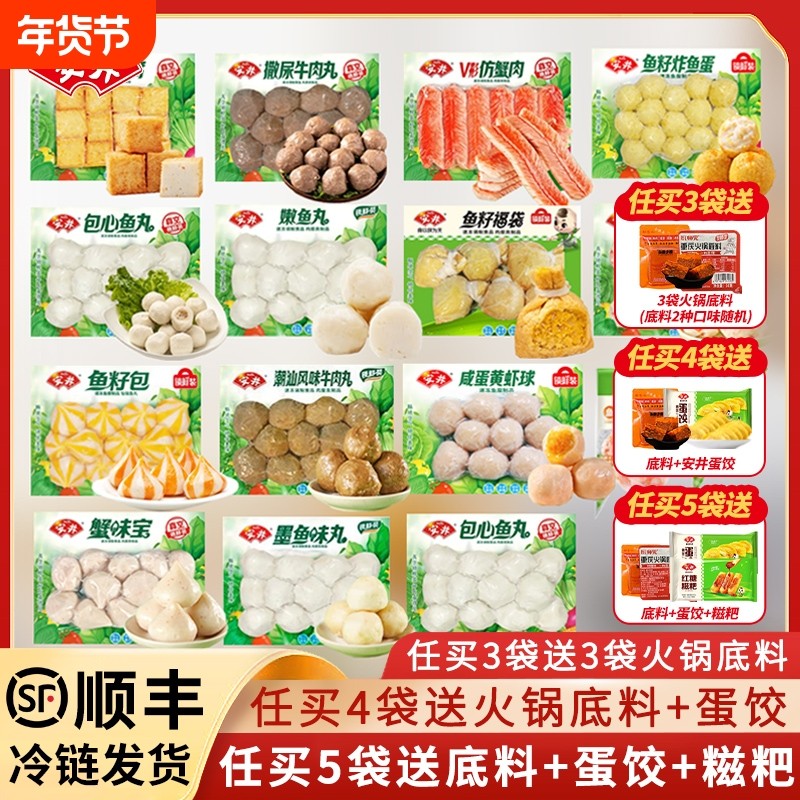 安井火锅丸子虾滑鱼丸撒尿牛肉丸鱼籽包鱼豆腐关东煮食材福袋虾球