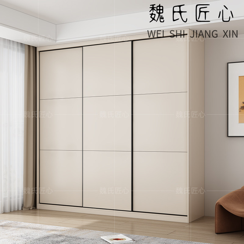 推拉门衣柜家用卧室柜子实木生态板滑移门衣柜奶油灰趟门衣橱定制