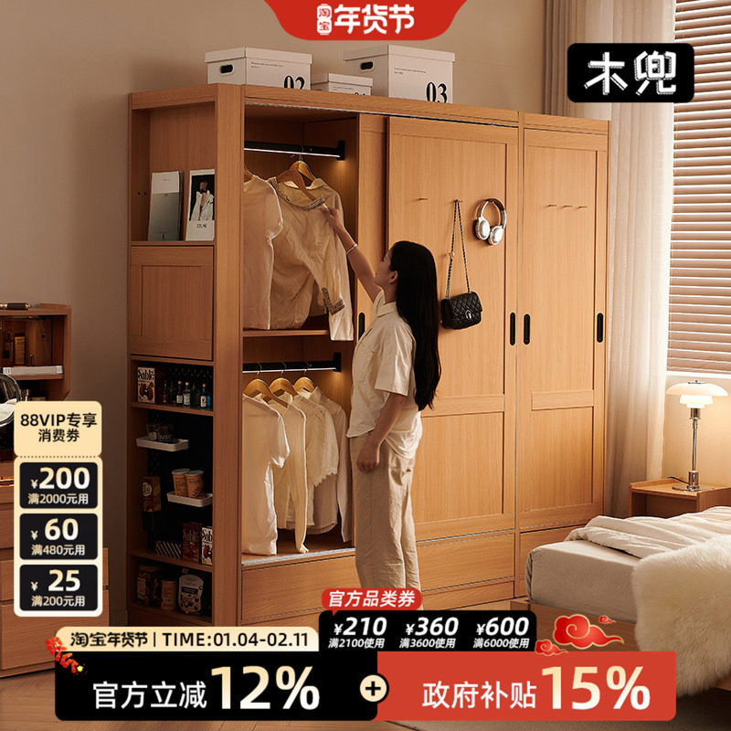 定制实木推拉门衣柜卧室家用2024爆款原木色衣橱中古风橡木收纳柜