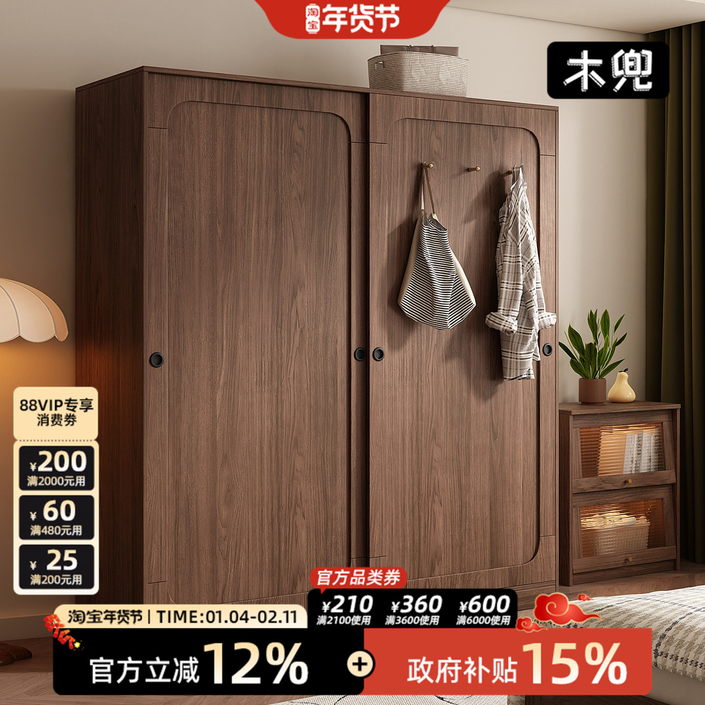 木兜家具云逸衣柜黑胡桃色中古风复古推拉门衣柜卧室家用实木衣橱