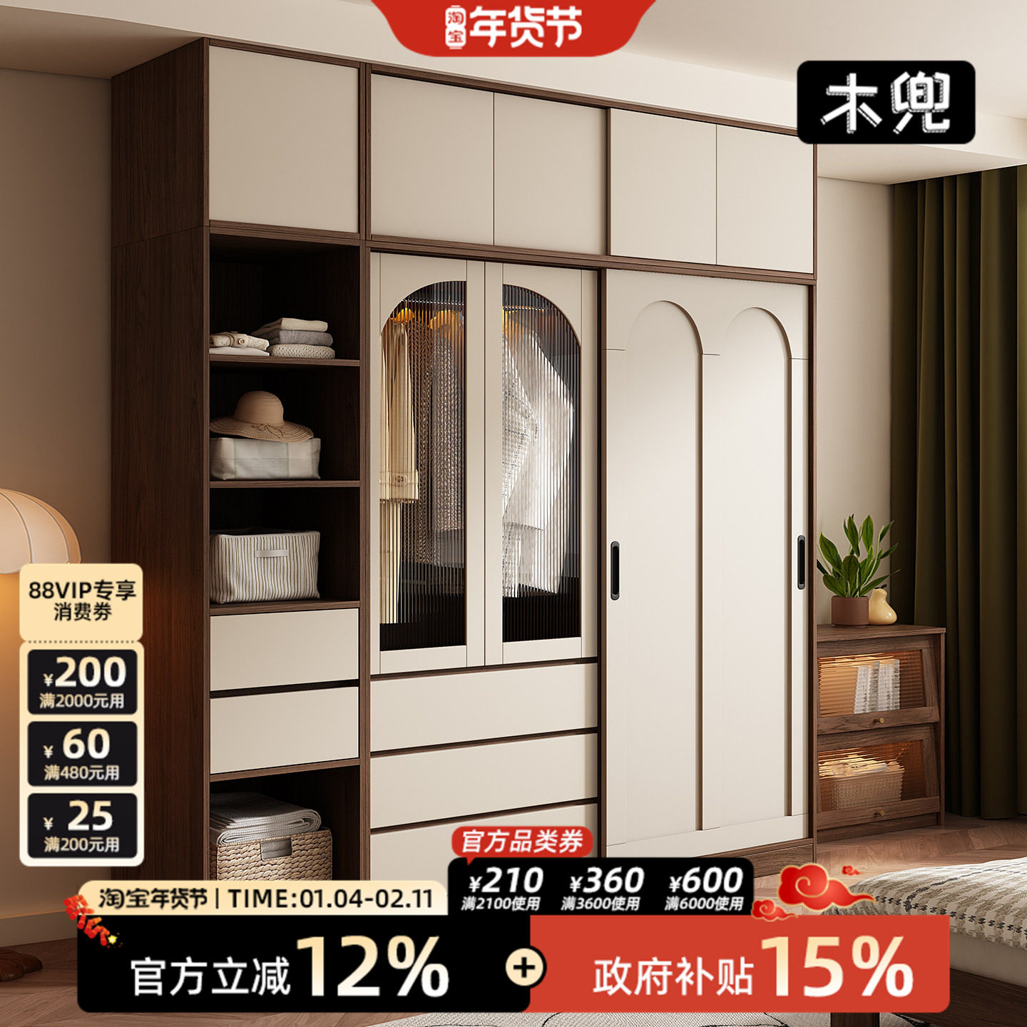 政府补贴定制推拉门衣柜胡桃木色到顶60深新款2025家用卧室橡木柜