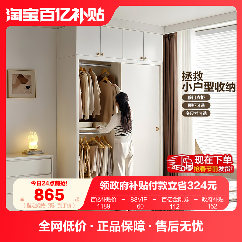 政补实木推拉门衣柜家用卧室现代简约小户型奶油风分段式移门衣橱
