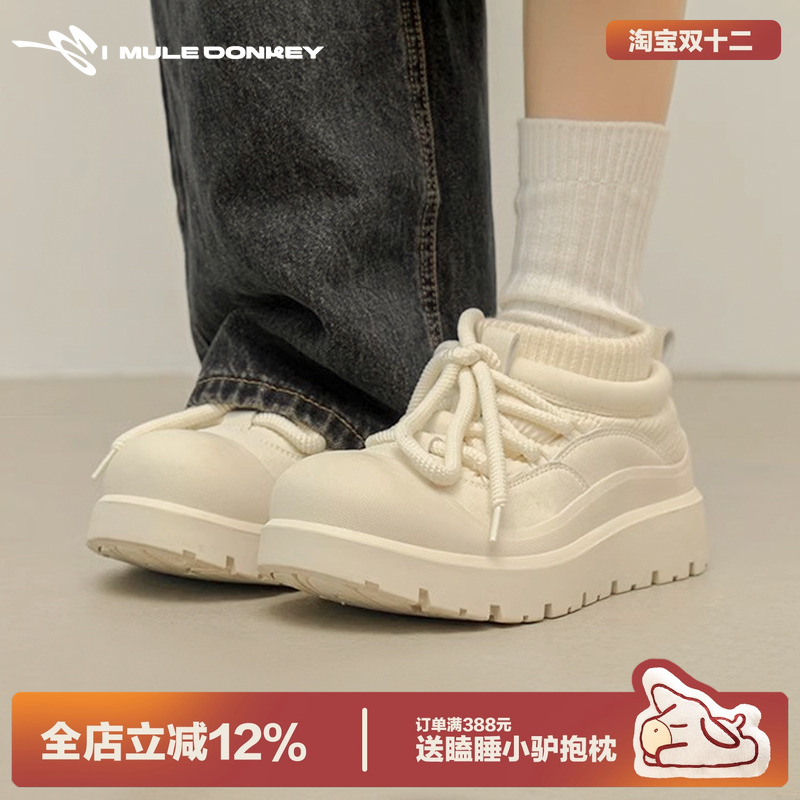 多嘴驴Donkey厚底雪地靴女加绒保暖短筒白色原创防水系带面包棉鞋
