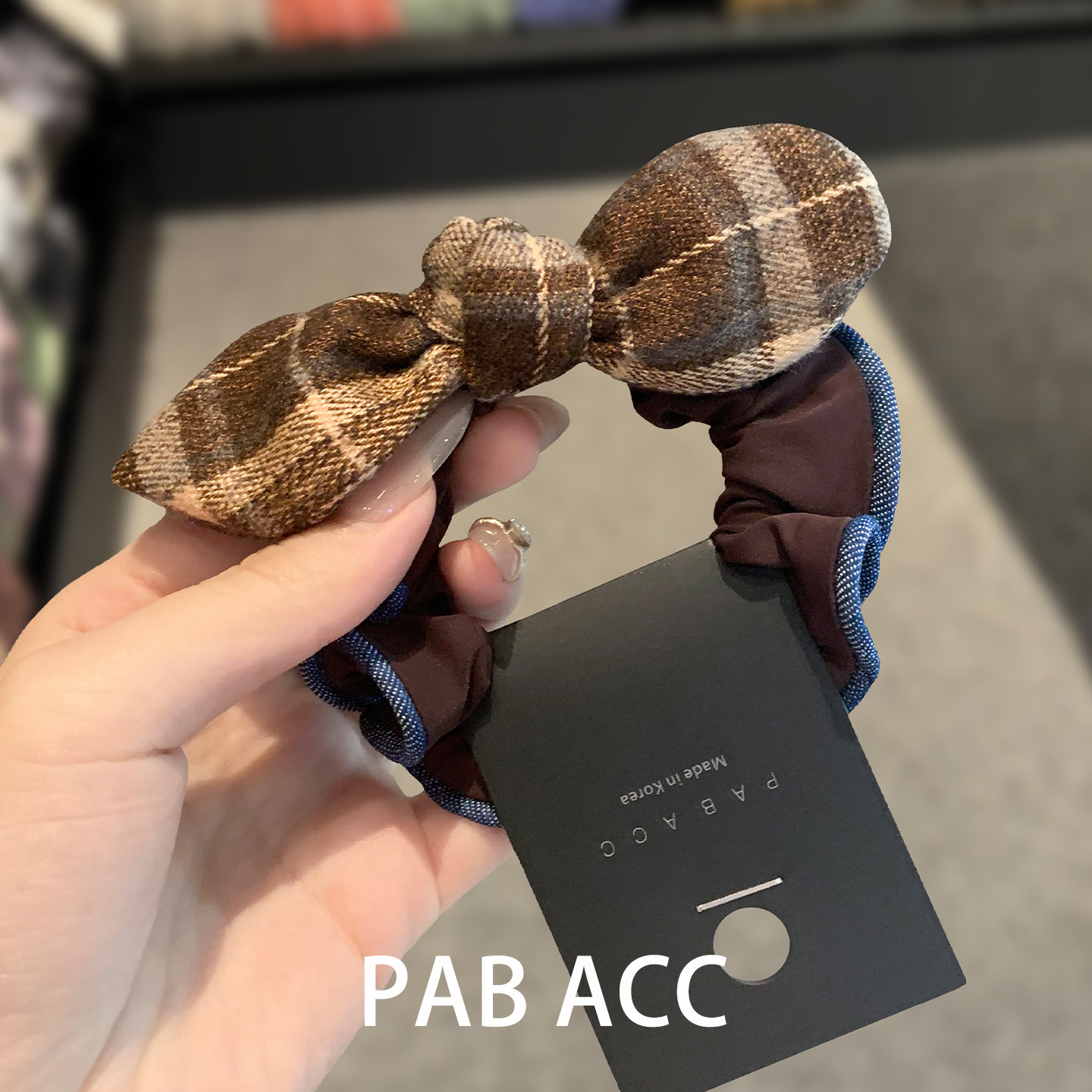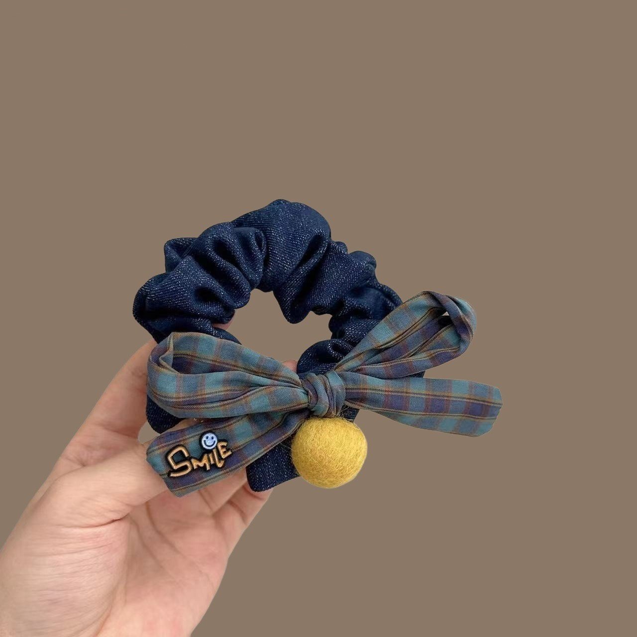 韩国百搭高级感少女学院风咖色格纹蝴蝶结小肠圈牛仔包边皮筋发圈