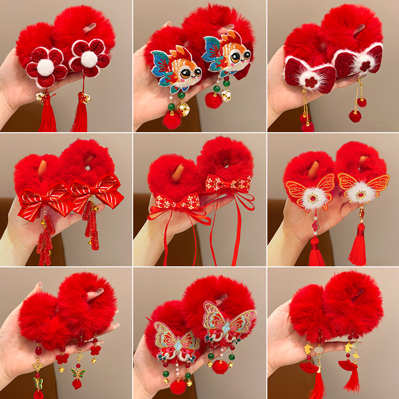 儿童新年毛绒发圈古风流苏女童国风发绳皮筋过年头饰红色头绳发饰