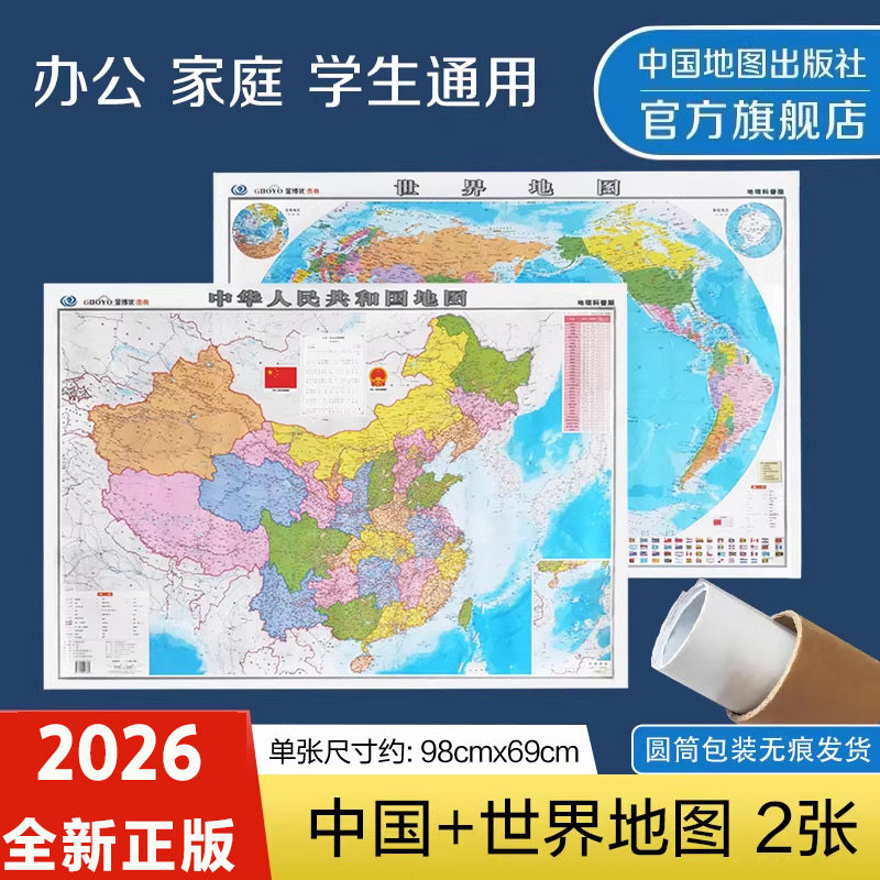【新华正版】中国地图和世界地图2026新版高清防水覆膜学生地理普及版彩绘诗词北斗地图初中生专用教室客厅挂图贴画中国地图出版社