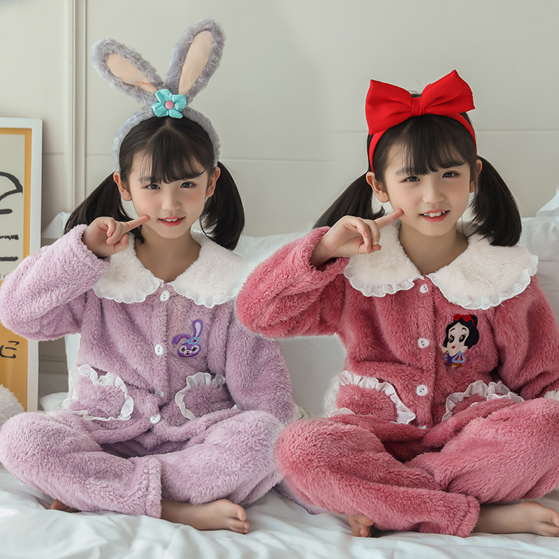 儿童睡衣女孩冬季珊瑚绒加厚款公主加绒套装女童宝宝法兰绒家居服