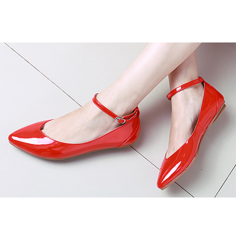 春季新款红色漆皮尖头平底单鞋软底真皮平跟女鞋浅口婚鞋大码船鞋