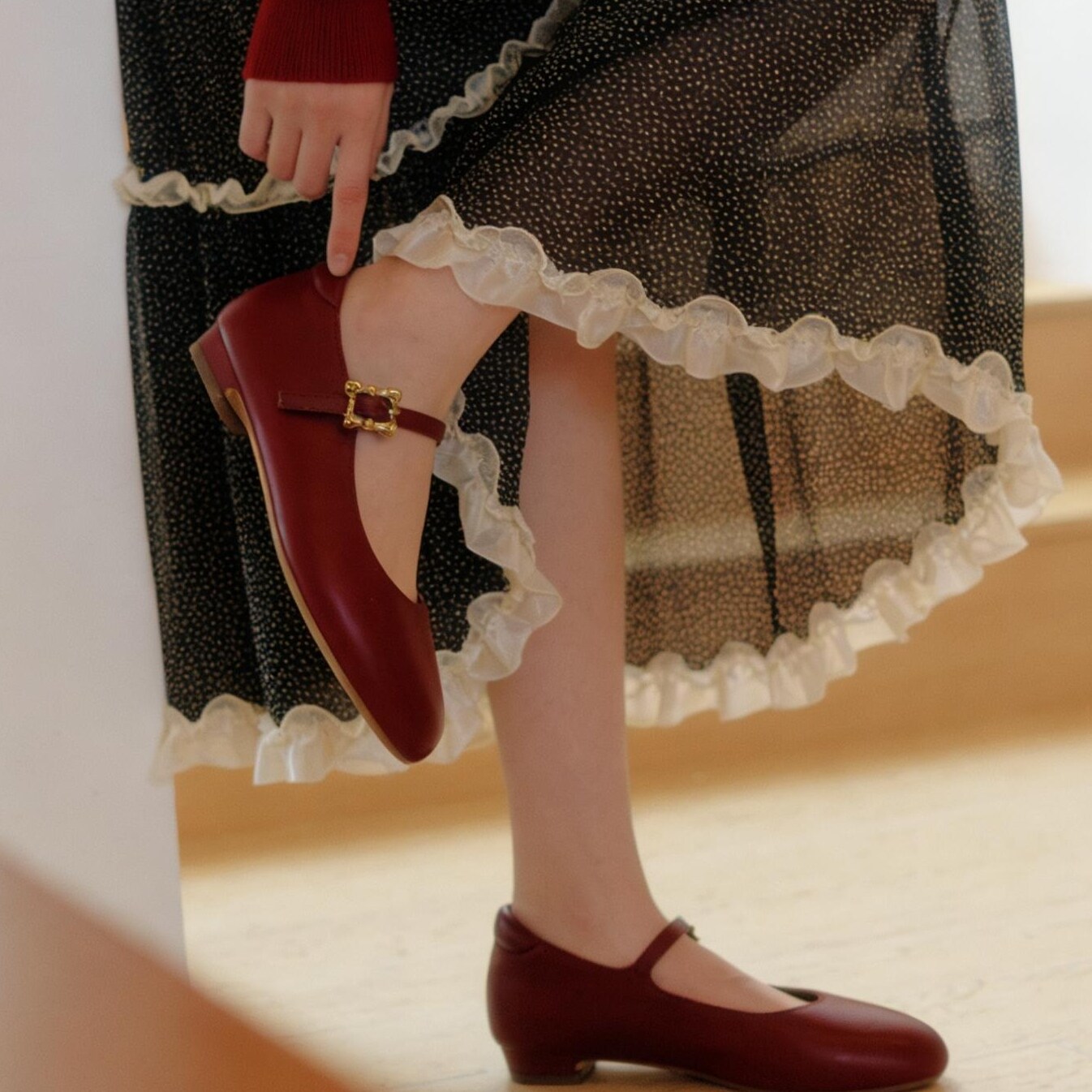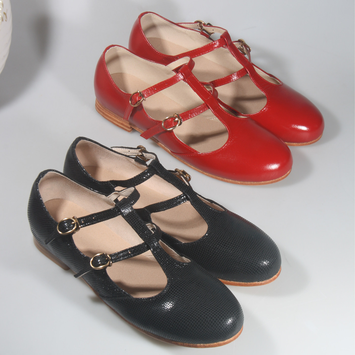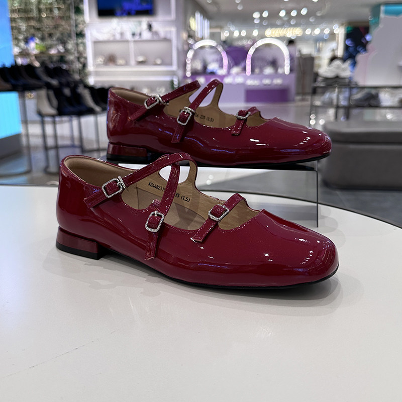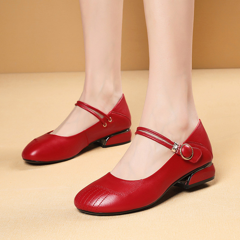 1cm真皮平跟红色浅口玛丽珍鞋女平底一字式扣带圆头舒适百搭单鞋